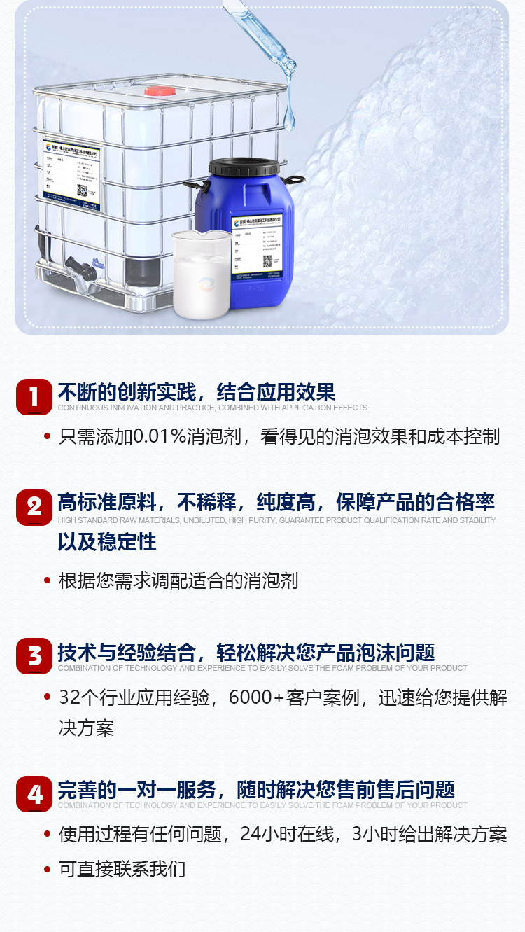 特點(diǎn):高固含量、用量少、消泡快、抑泡長、水溶性好、可稀釋后用